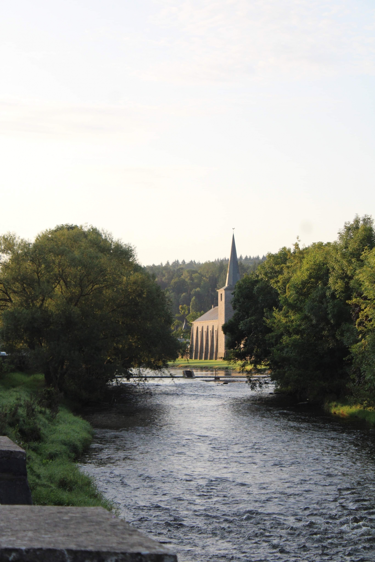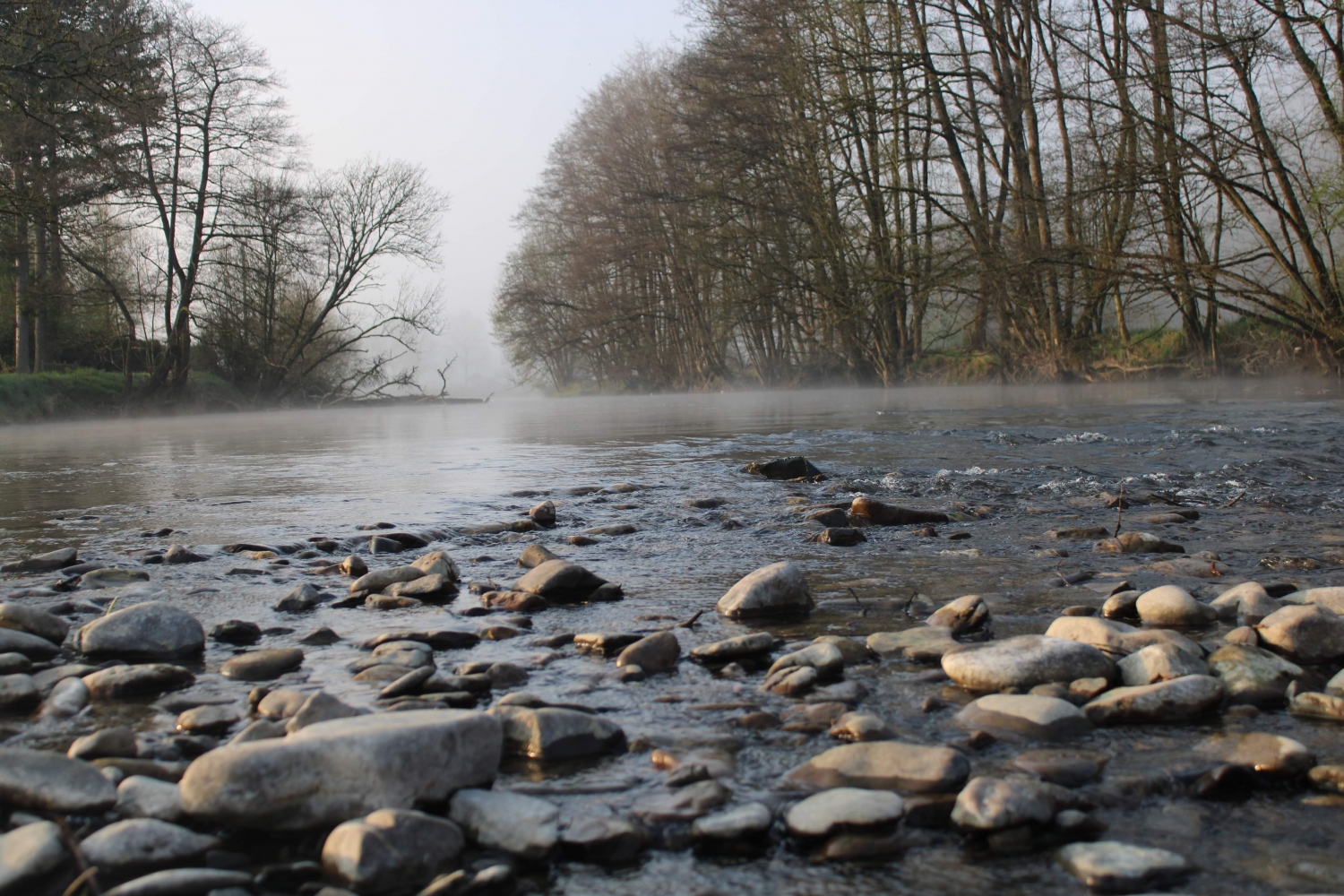 De oevers van de Ourthe die zich bij de eerste zonnestralen ontpoppen tot groene stranden.